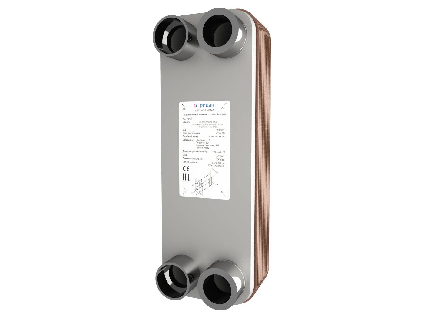 Ридан 111B0175R — Теплообменник пластинчатый паяный BPHE_RD-27-30-3,0-H-Q1Q2(L3/4")/Q3Q4(H1/2")/2-M8*23